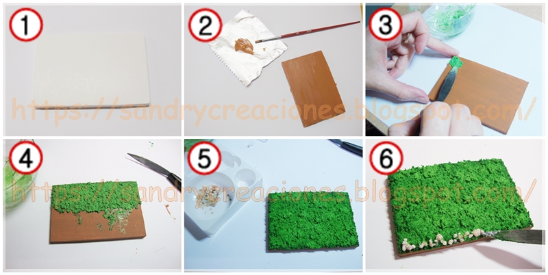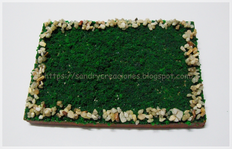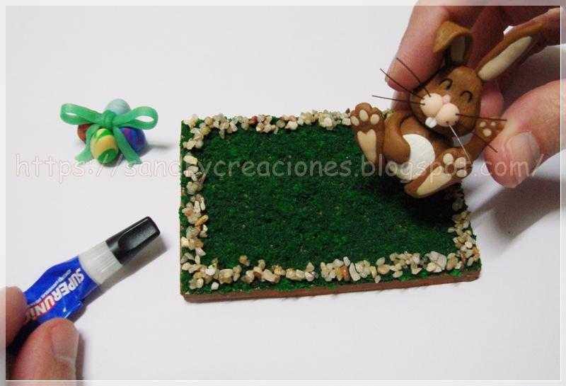 Base de cartón pluma decorada con hierba artificial y piedras: podemos unir el conejo de Pascua y el conjunto de los huevos de Pascua en una base hecha en cartón pluma y decorada con hierba artificial mezclada con cola blanca y piedras para maquetas mezcladas con cola blanca.