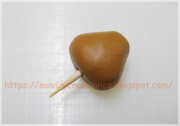 Paso 2. Realizamos la cabeza del conejo de Pascua. Dejamos apartado lo realizado en el paso anterior y nos metemos de lleno con la cabeza del conejo de Pascua. En primer lugar damos forma general a la cabeza y le clavamos un trozo de palillo en la parte inferior para unirlo con el cuerpo en pasos posteriores.
