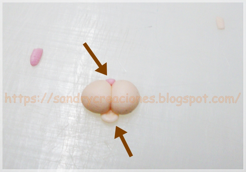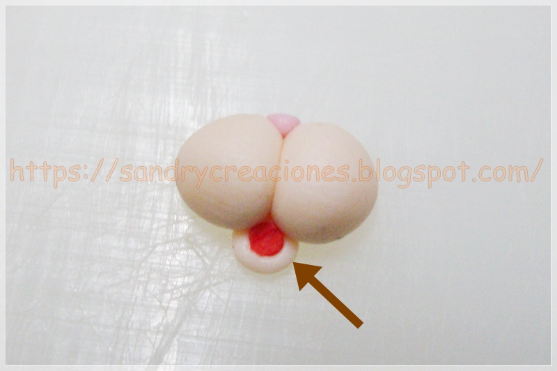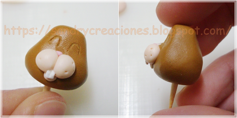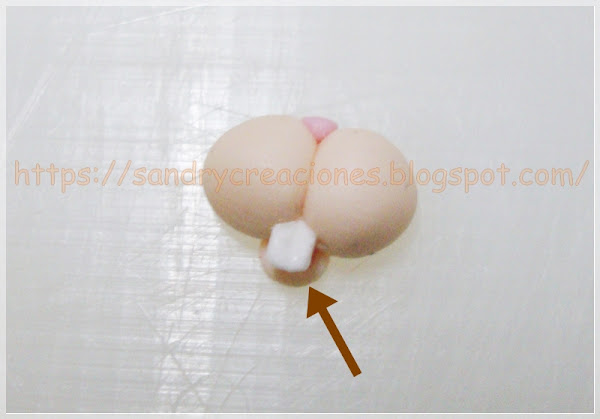 Seguidamente con un pequeño trozo de arcilla polimérica de color carne hacemos la zona de la boca y con un trozo pequeño de arcilla polimérica de color rosa hacemos un pequeña forma triangular que será la nariz del conejo.