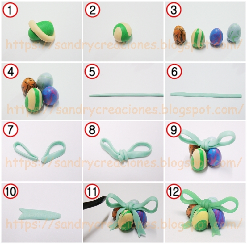Huevos de pascua: Podemos acompañar a nuestro conejo de Pascua con un conjunto de huevos de Pascua hechos con arcilla polimérica de diferentes colores mezclados entre sí y coronados con un lazo.