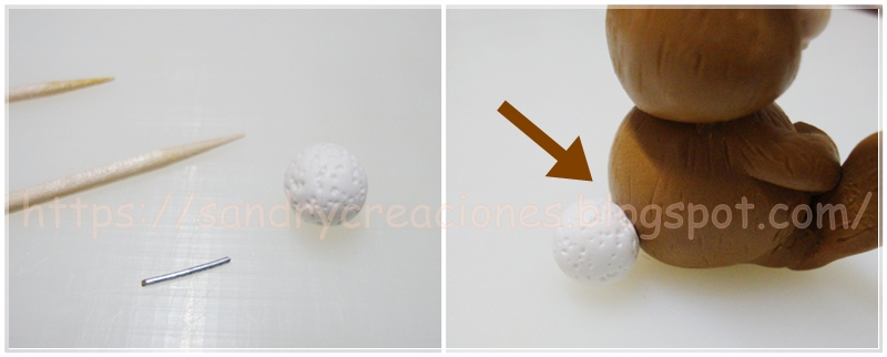 Paso 9. Realizamos la cola del conejo de Pascua. Finalizamos la estructura del conejo con su cola, para ello hacemos una pequeña bola de arcilla polimérica de color blanco, la punteamos con un palillo, le clavamos un trozo de alambre fino para unirla con el cuerpo del conejo y finalmente la unimos al cuerpo del conejo por la parte inferior trasera del cuerpo.