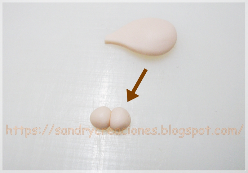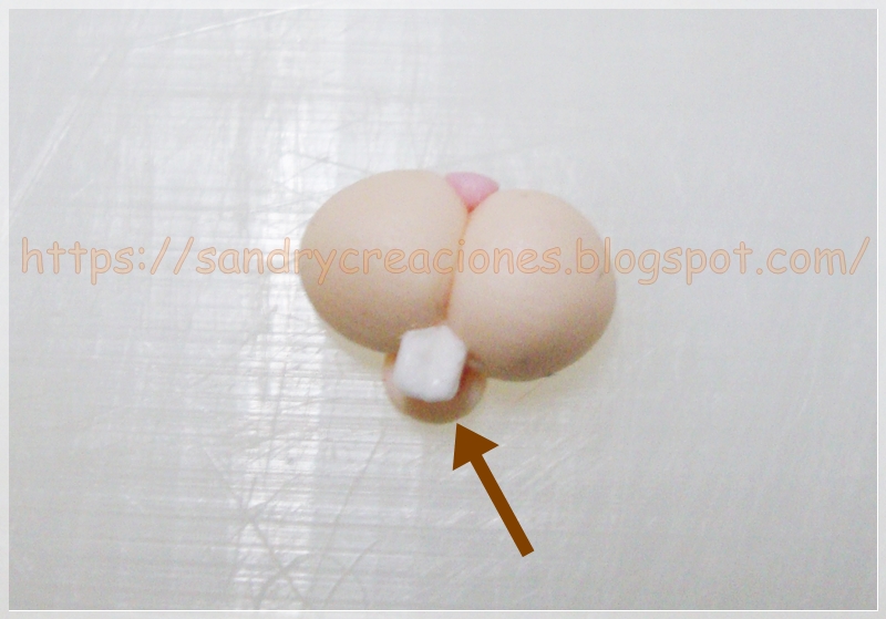 Paso 3. Realizamos el morro del conejo de Pascua. Dejamos también aparcada la cabeza del conejo y nos ponemos con el morro del conejo de Pascua. Para realizarlo utilizamos dos bolas pequeñas de arcilla polimérica de color carne que juntamos y aplastamos por un lado para dar forma de morro de conejo.