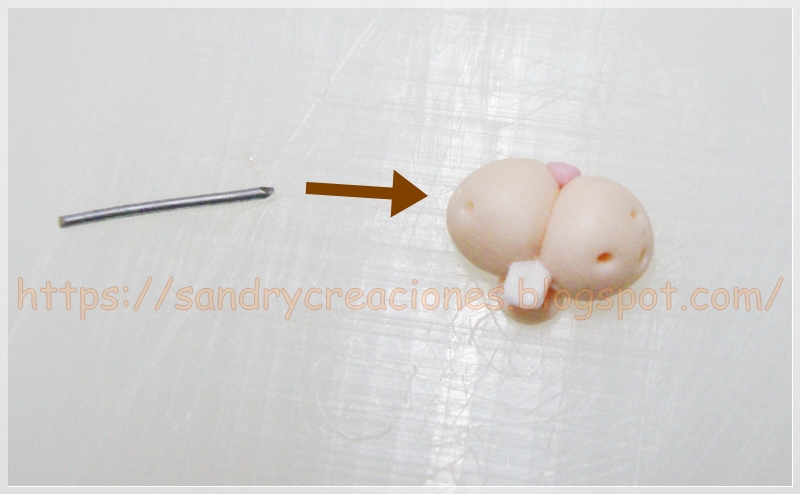 Para finalizar este paso, con una herramienta, marcamos el pelo del conejo y con un palillo perforamos la zona donde irá colocada la cabeza de nuestro conejo.