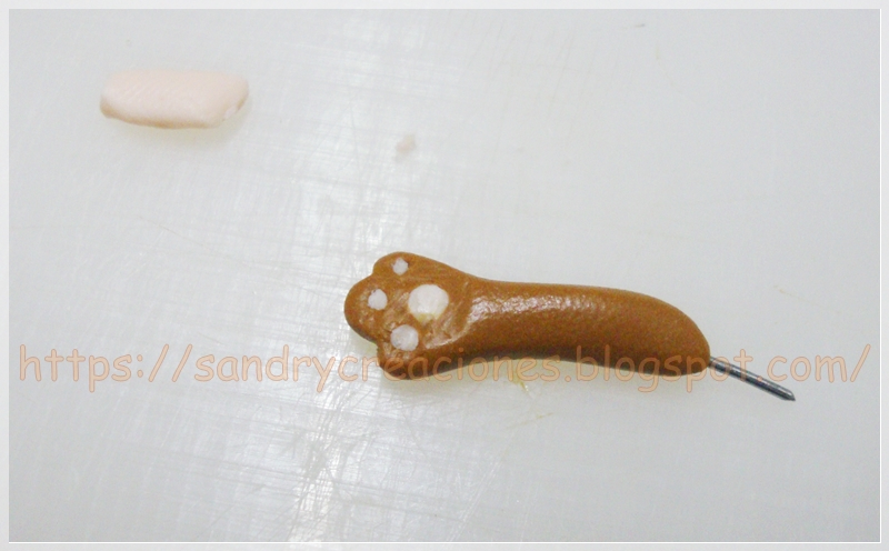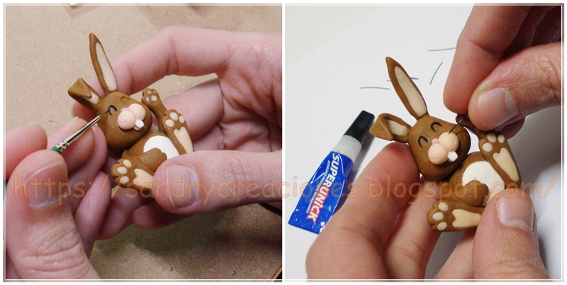 Luego los unimos al cuerpo del conejo junto con un trozo pequeño de arcilla polimérica marrón que situamos en el extremo superior del lado más estrecho del pie y que simulará el resto de la pata del conejo: