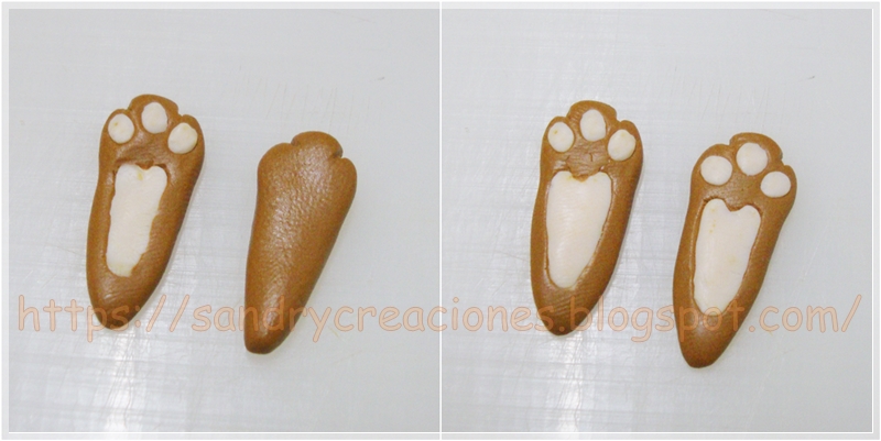 Paso 8. Realizamos las patas traseras del conejo y las unimos al cuerpo del conejo. Para realizar las patas traseras damos forma a dos trozos de arcilla polimérica marrón simulando los grandes pies traseros de los conejos y hacemos los detalles con arcilla polimérica de color carne, podéis ver la forma en las imágenes siguientes: