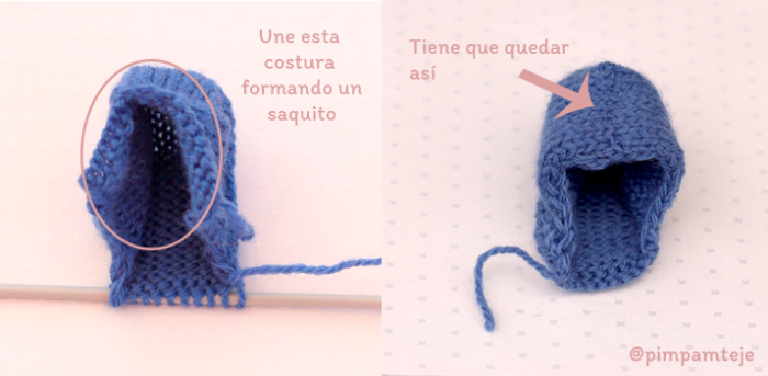 Monta 4 puntos y teje a punto jersey (una pasada del derecho y otra del revés) durante 17 pasadas.