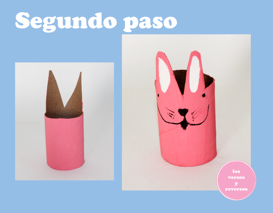 Ya que teníamos el color listo, las manos de la pequeña princesa pintaron el rollo de papel. Después pintó las orejas con la pintura acrílica blanca y ya que estaba todo muy seco, con el marcador negro, le hizo la carita al conejo.