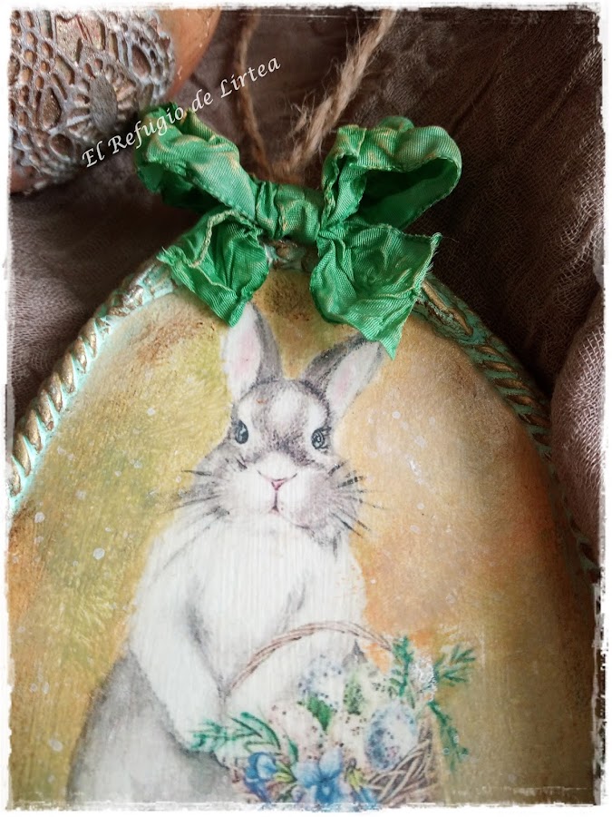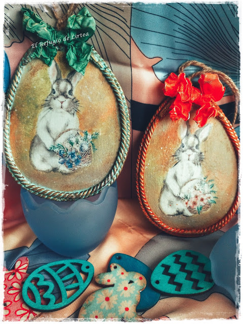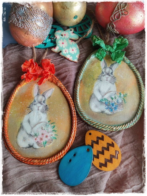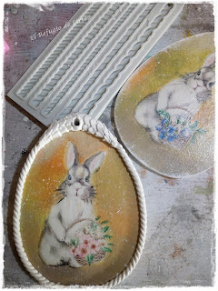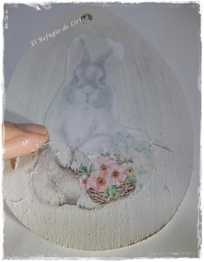 Este mes las redes se llenaran de trabajos relacionados con la Pascua, ya sabéis que yo suelo decorar huevos para estas fechas, pero esta vez he cambiado los huevos por unas imágenes de conejos, sobre una base de madera pero eso sí, con forma de huevo como no podía ser de otra forma.