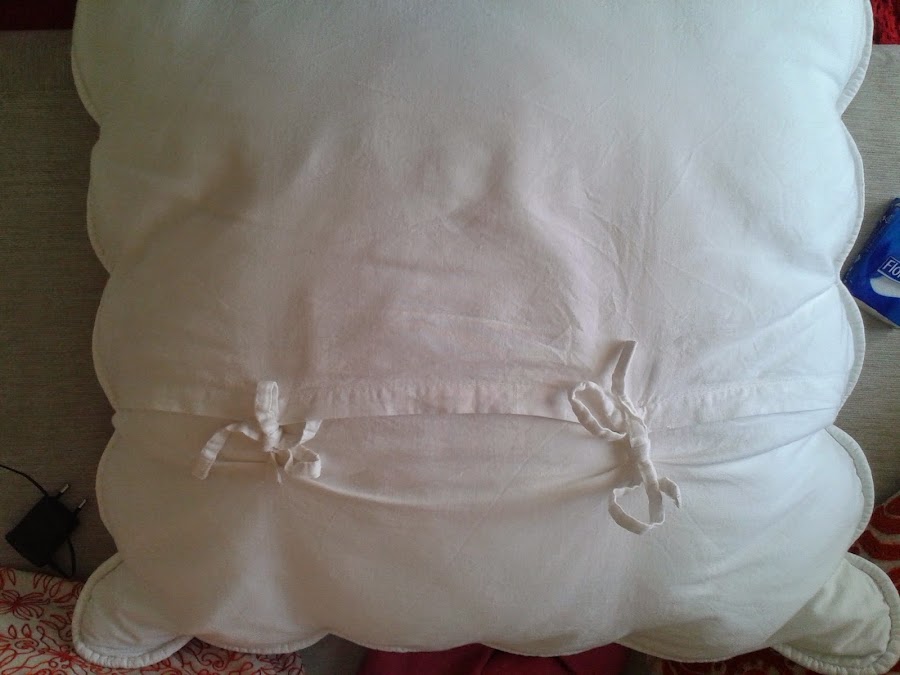 Una vez hechos los dobladillos, se dobla la tela dejándolos mas o menos en el centro del cojín, mirad que os quede la medida de 50 x 50 más los dos centímetros que se quedan para poder coserlo siempre con la tela del revés, se trata de hacer una abertura en la funda para poder meter el cojín, ya que no le ponemos cremallera, podéis verlo en la foto de debajo, en este caso, como la tela es muy fina, le he puesto unas cintas para atar la abertura, pero si la tela no es tan fina, no hace falta ponerle nada, montaría una solapa en la otra y no se abriría.