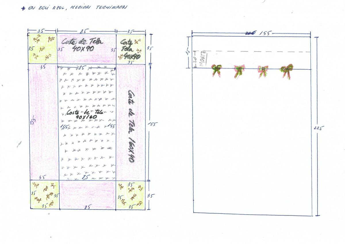 Tejido sábana blanca: Cortar un trozo de 40 cm x 155 cm. y otro trozo de 210 cm. x 155 cm. (aproveché así todo el tejido que compré)