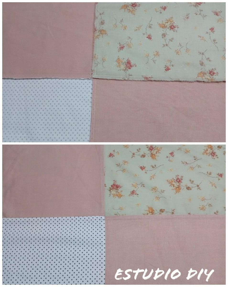 El primer paso será unir las tiras rectangulares del tejido rosa empolvado, con el tejido estampado, como se aprecia en el dibujo adjunto (las más largas corresponden a los laterales, y las más pequeñas a la parte superior e inferior, de la funda nórdica). Sujetamos con alfileres, para después pasarle un pespunte y sobrehilado. Planchamos las costuras.