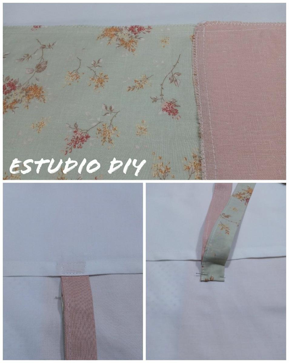 Comenzamos por las lazadas, para las cuales utilizaremos el tejido que nos ha sobrado de realizar el delantero de la funda. Cortamos ocho tiras de 35 cm. de largo por 7 cm. de ancho (cuatro del tejido rosa y cuatro del tejido estampado). A continuación, con la ayuda de la plancha, doblamos 0,5 cm., hacía el interior del tejido, en uno de los laterales más cortos. Una vez que hemos hecho esto, pasamos a doblar 1 cm., a cada una de los dos partes más largas (como se aprecia en la imagen); doblamos por la mitad la tira resultante, y planchamos. Pasamos un prepunte a máquina.