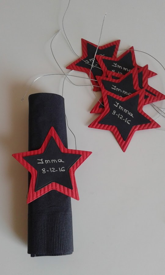 També vaig fer unes estrelles per posar als tovallons, i on hi vaig escriure el nom i la data. Com que els tons de la taula era gris i blanc , vaig voler donar-li una mica de color amb les estrelles.