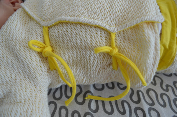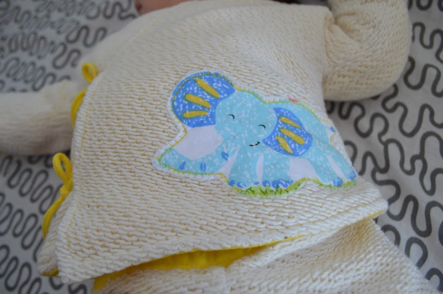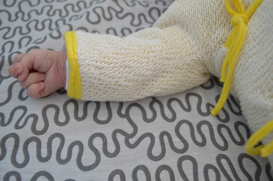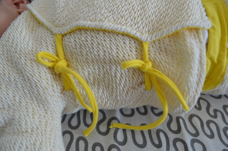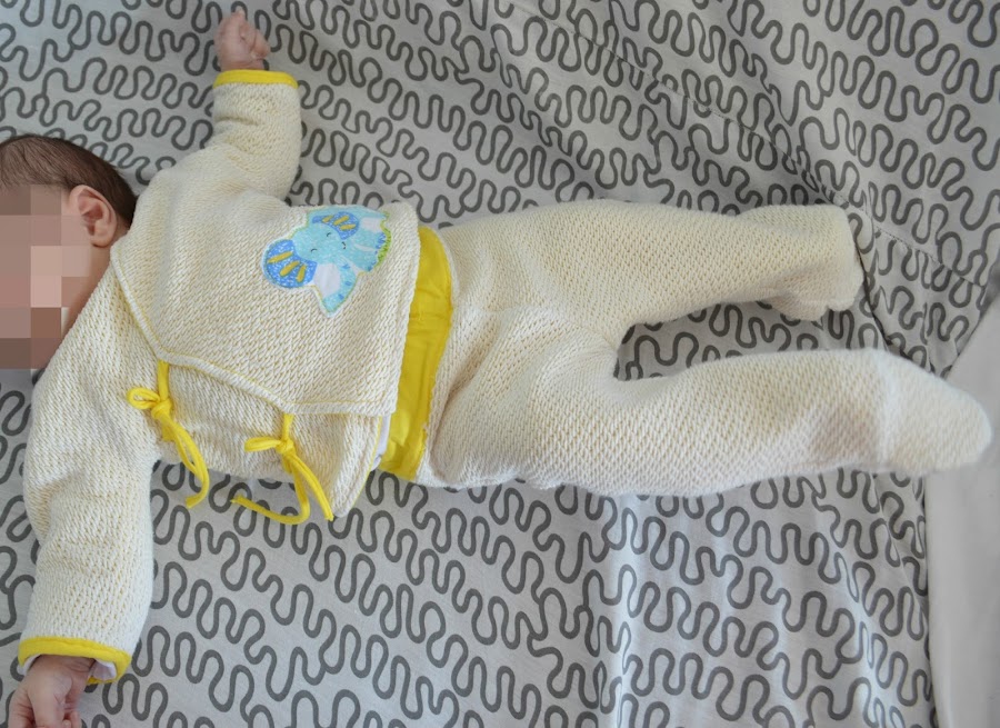 Esta fue una de las primeras puestas que cosí... con una tela de tricot y forrado con tela de camiseta amarilla. Por fin se lo he podido poner... y aunque un poco justo, le va!