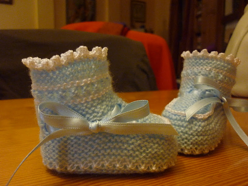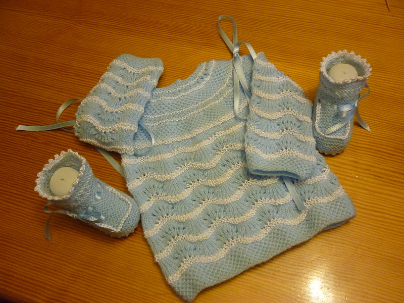 Aquí está el tercer conjuntito para el nietito de Fabi. Vista delantera Espalda Los zapatitos, dos vistas diferentes Y el conjuntito completo. Esta vez está hecho con lana Bebé de Stop y perlé en azul celeste. Muchísimas gracias, Fabi.