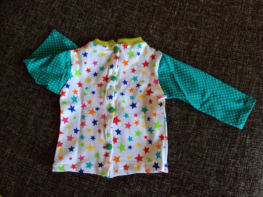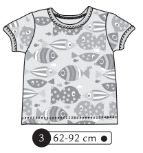 La camiseta la he sacado de la revista Ottobre 3/2014 modelo 3 alargando mangas y haciendo corte en la parte posterior poniendo snaps, para que sea más fácil cambiar al peque. La talla he cogido la más pequeña, sin margen alguno.