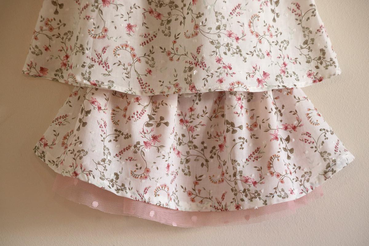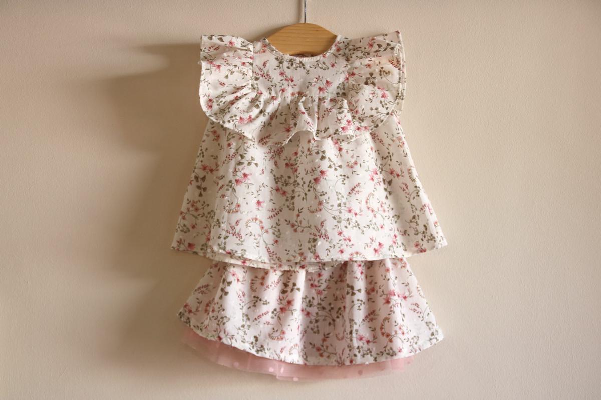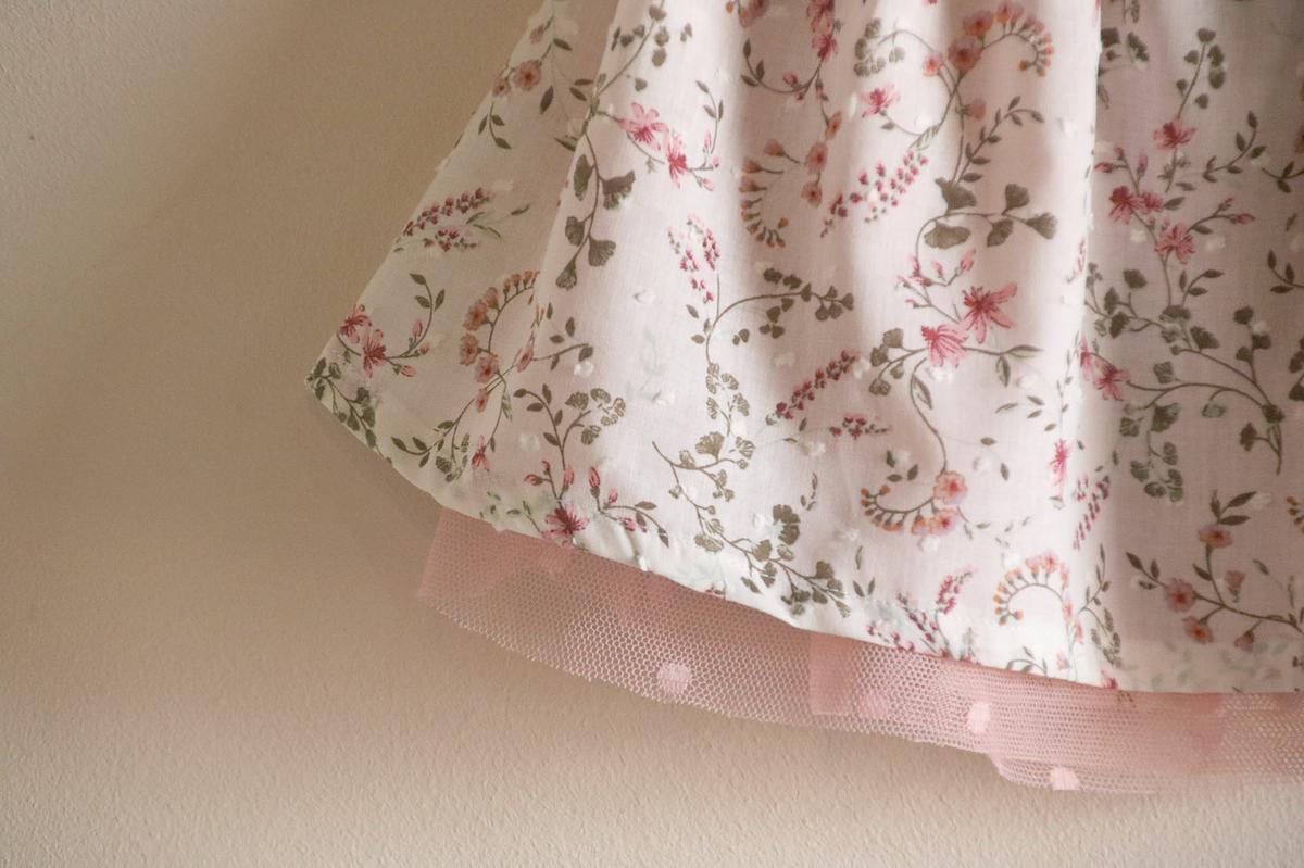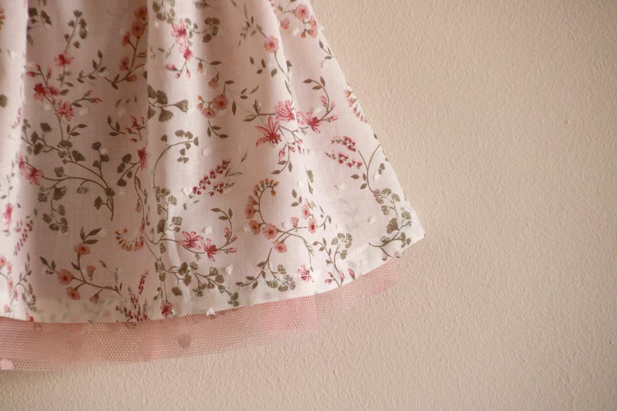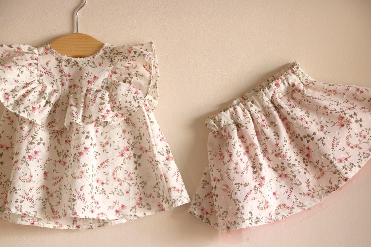La tela que he elegido para realizar este conjunto es un plumeti estampado y un tul plumeti para el forrito de la falda. Para este conjunto os aconsejo que utilicéis telas finitas: voile, plumeti, batista, popelín…