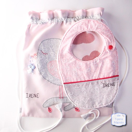 Hoy os traigo un kit canastilla en versión reducida, se compone de bolsa-mochila para la guardería y babero a juego. Fue un encargo de un compañero de trabajo de mi chico. Cada vez que me acuerdo que estuvieron juntos mirando el blog a ver que elegían me entra la risa. Ja ja ja, no me los imagino codo con codo delante del ordenador decidiendo que si mejor babero o mejor bolsita.