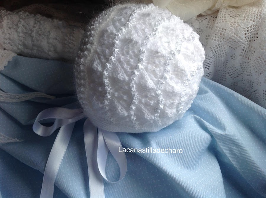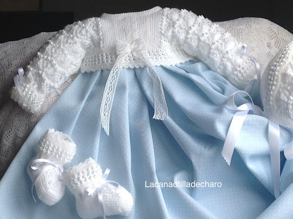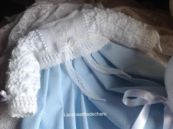 TOTALMENTE REALIZADO A MANO CON LANA-PERLE-ANGORA BLANCO Y TELA DE PIQUE DE TOPITOS BLANCOS Y LA BASE DE UN PRECIOSO TONO AZUL.