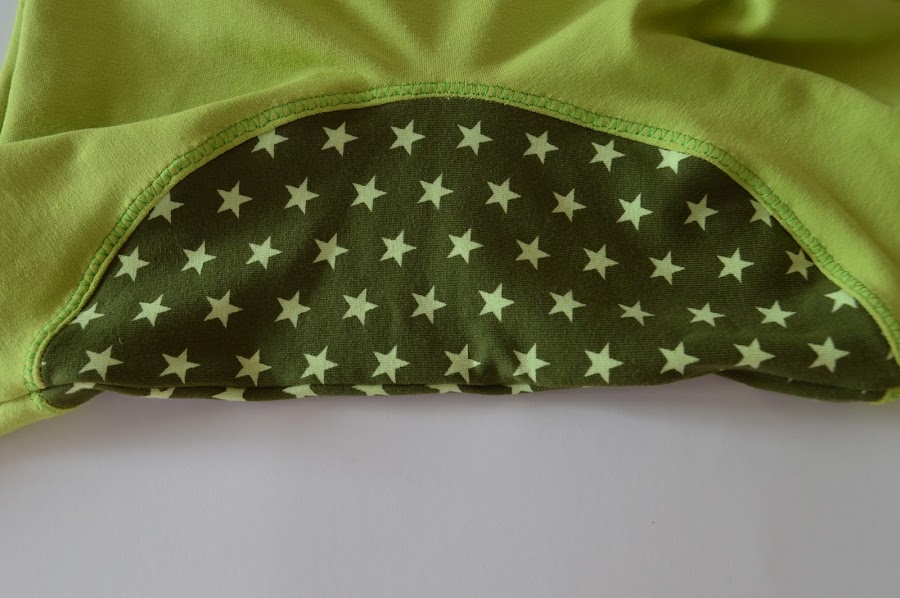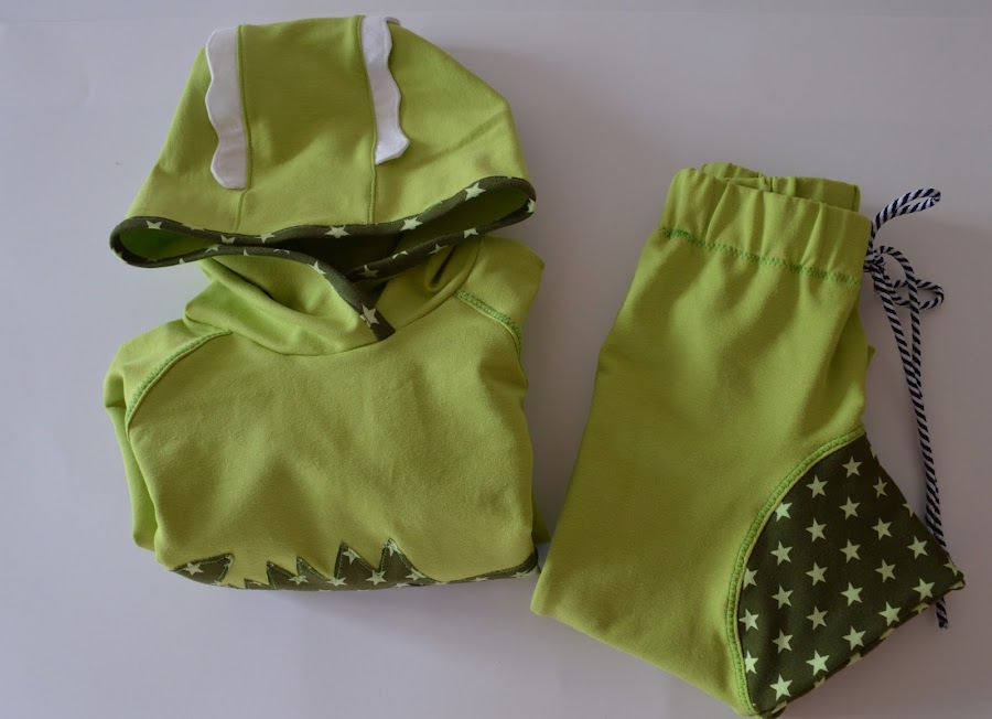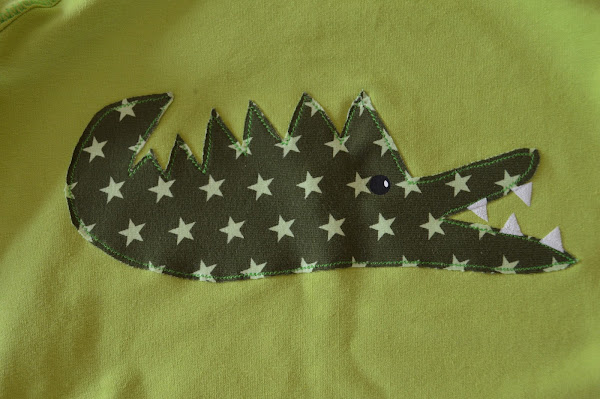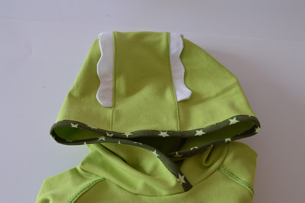 La capucha la he ribeteado con tela de camiseta y la aplicación de los dientes también, aunque doble y entretelada. Que los cocodrilos no tienen ahí los dientes? ostras es verdad! jajaja me di cuenta después que esta pieza debería haber sido verde, pero también queda muy mono, o no?
