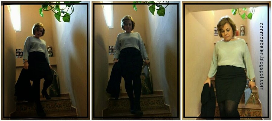.....no pude ( oh qué pena!!!!), hacerme fotos en el exterior porque llovía a mares, pero os digo que la chaqueta no va nada con la falda, pero con unos leggings negros, la blusa y taconazos me gusta mucho.