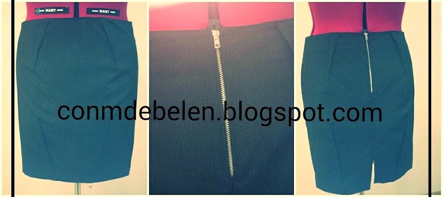 lleva pinzas en la cintura y en el bajo, cosidas por el derecho de la prenda, muy entubada, rematada sin cinturilla, con la cremallera en el centro de la espalda, que yo he puesto metálica y a la vista, no he tenido que retocar nada, la talla 44 me queda como un guante.