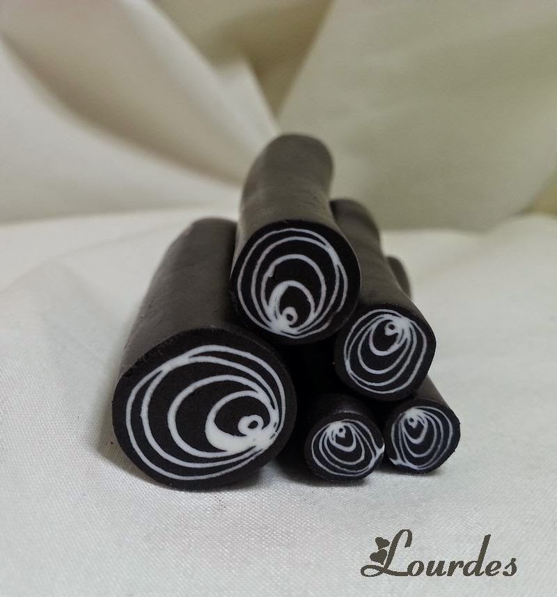 Mi último vídeo, esta vez se trata de una murrina que queda muy bonita y se hace con la extrusora, se conoce como murrina retro, y se pueden combinar muchos colores. Éstas son algunas de las cosas que he hecho con esta murrina, en otros colores, aparte de las que salen en el vídeo. Desde luego, mucho mejor en blanco, negro y rojo...