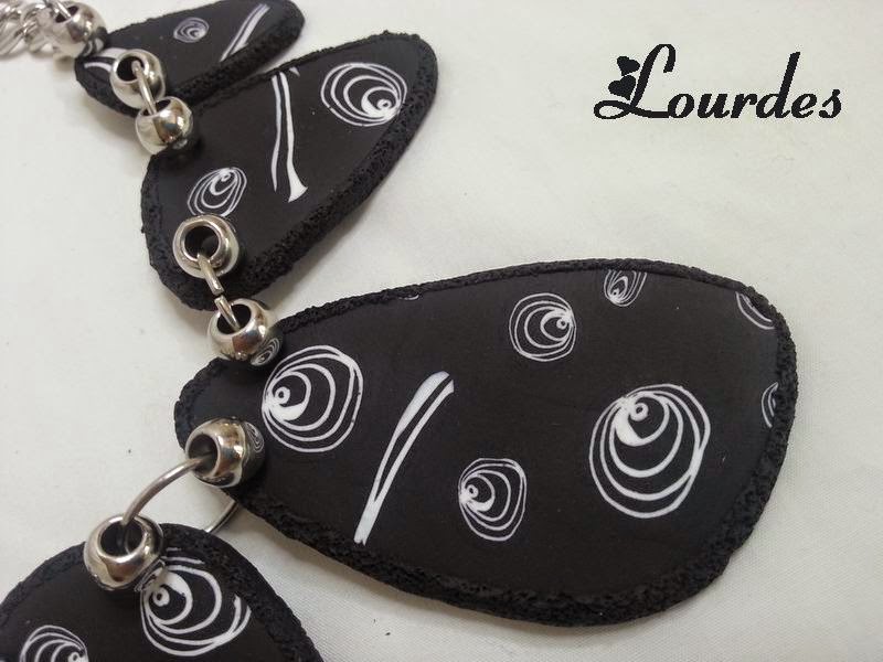 Necesitaba hacer unos conjuntos en blanco y negros así que preparé esta sencilla murrina de flor negra sobre fondo blanco El colgante largo está realizado con alambre plano negro y rematado con alambre negro para la unión de piezas y cordón de cola de ratón en negro El anillo lleva alambre negro alrededor de la pieza Y aquí podéis ver el conjunto completo