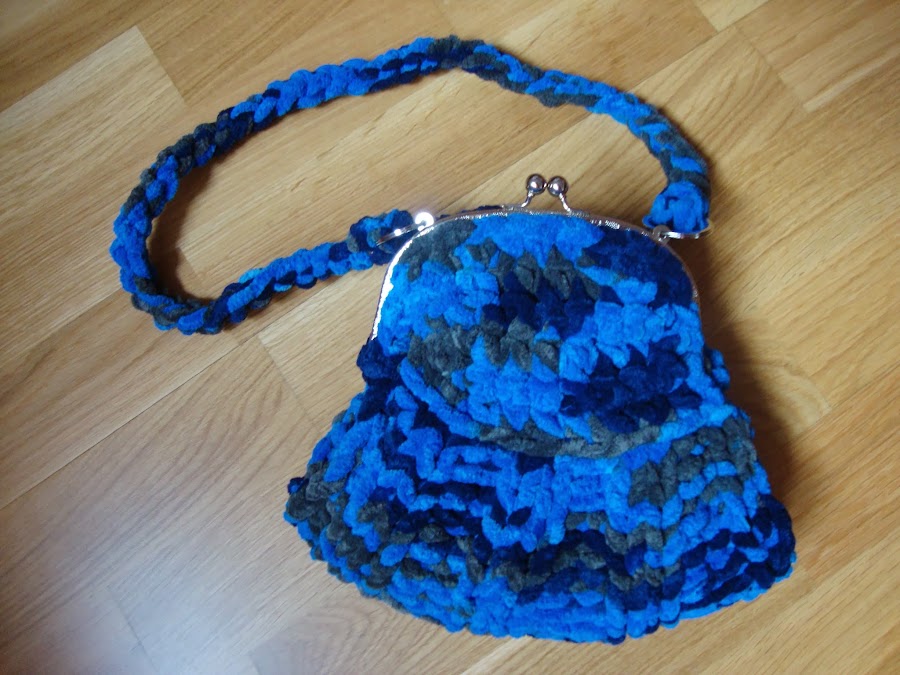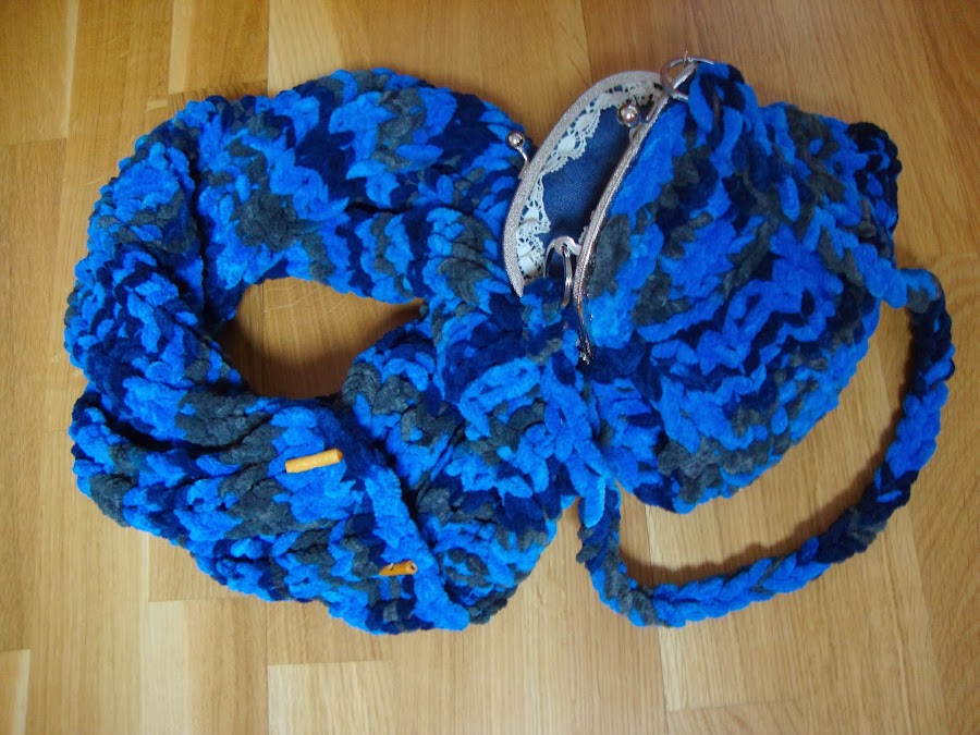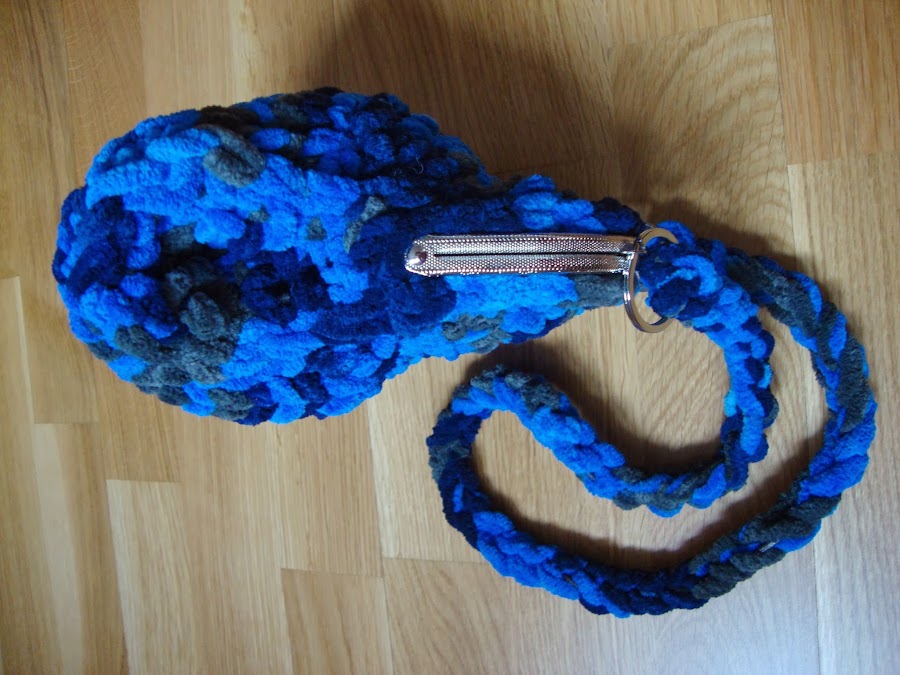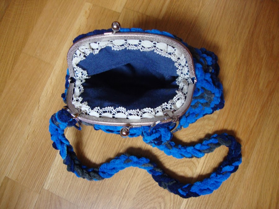 El asa-colgador está hecha con una cadeneta de lana doble, reforzada por dentro con un cordón y unida a las sujeciones que traía el cierre por unas arandelas que añadí.
