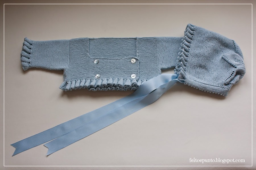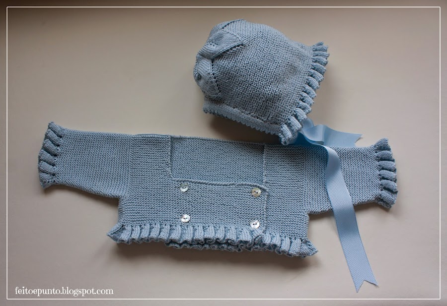 Está tejida en algodón azul celeste, toda tejida a punto bobo, y rematada en bajos y mangas con un volante muy recargado.