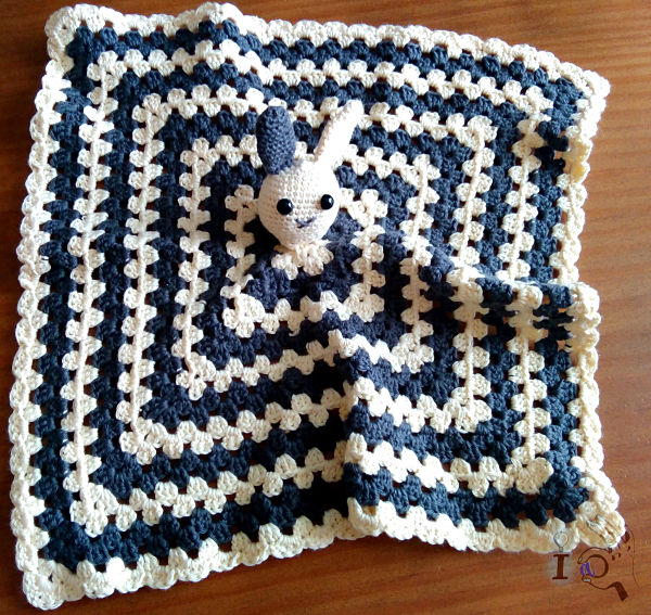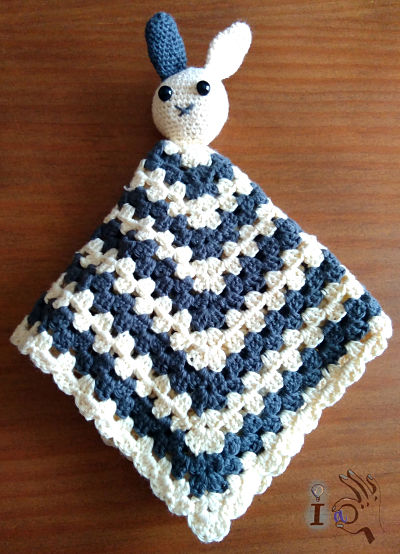 Comencé haciendo la mantita de apego, con este simpático conejito que tiene una oreja de cada color. La mantita es simplemente un granni en el que los colores se intercambian cada dos vueltas.
