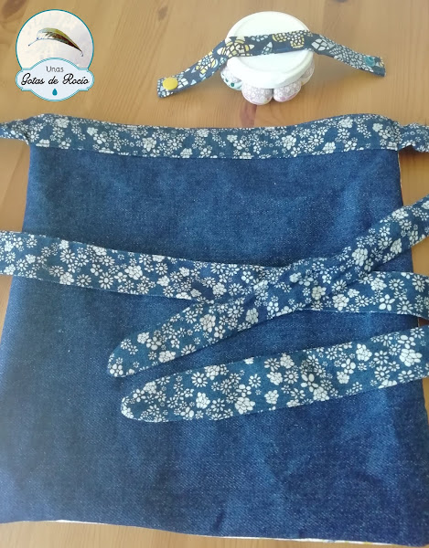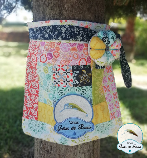El delantero de la bolsa es un log cabin, la trasera una tela vaquera y la cinta para la lazada, una vaquera estampada. He colocado un bordado con mi logo en el frente como podéis ver.