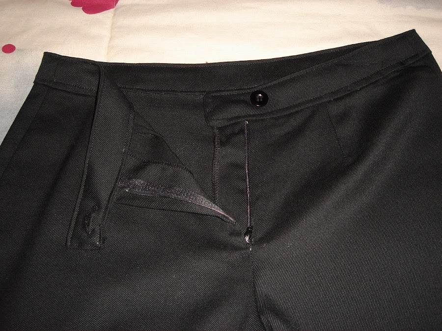 Los pantalones no llevan bolsillos tan solo llevan una cremallera central y cinturilla con boton plano de color negro.