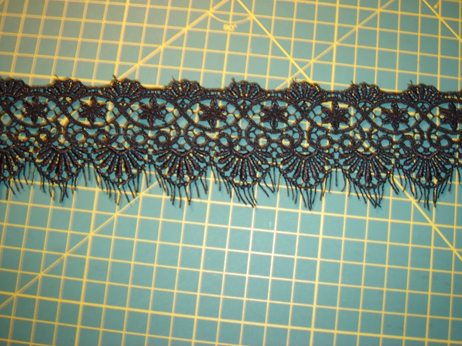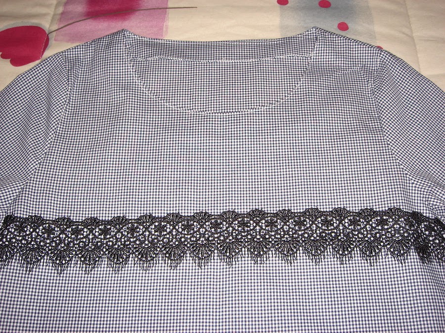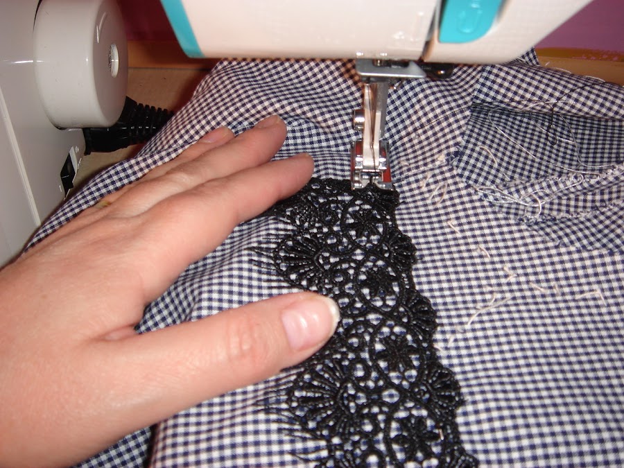 Tenia esta puntilla negra guardada sin saber donde coserla , asi probando un adorno para la blusa vi que la puntilla quedaba genial.