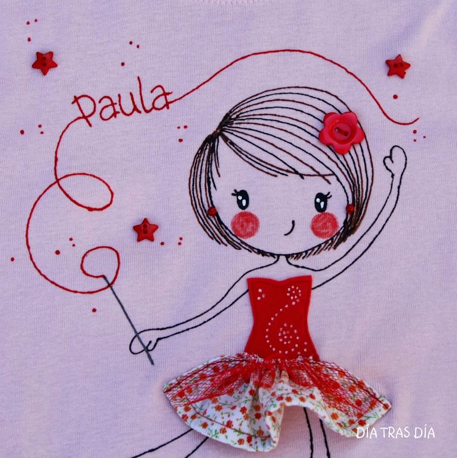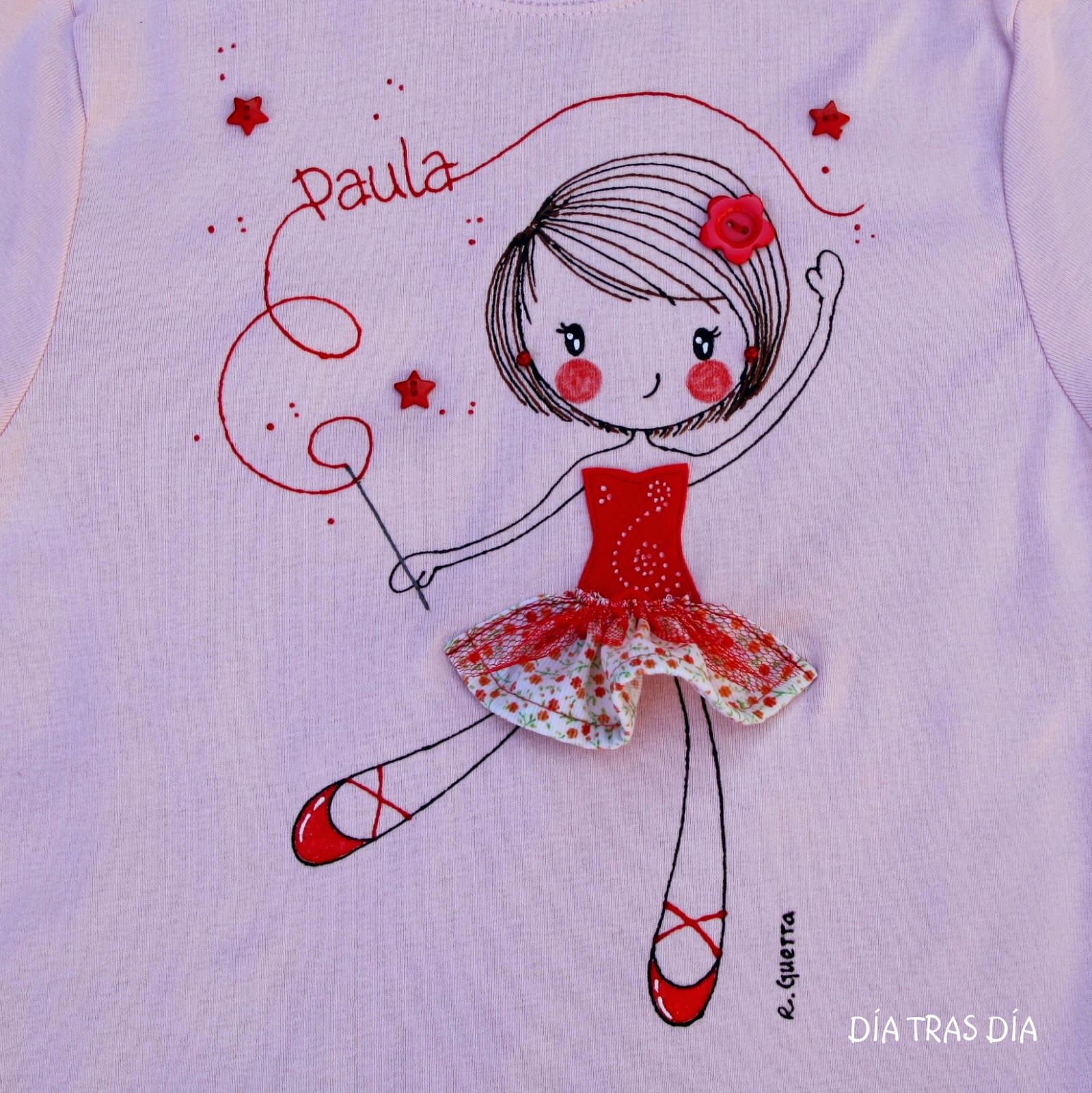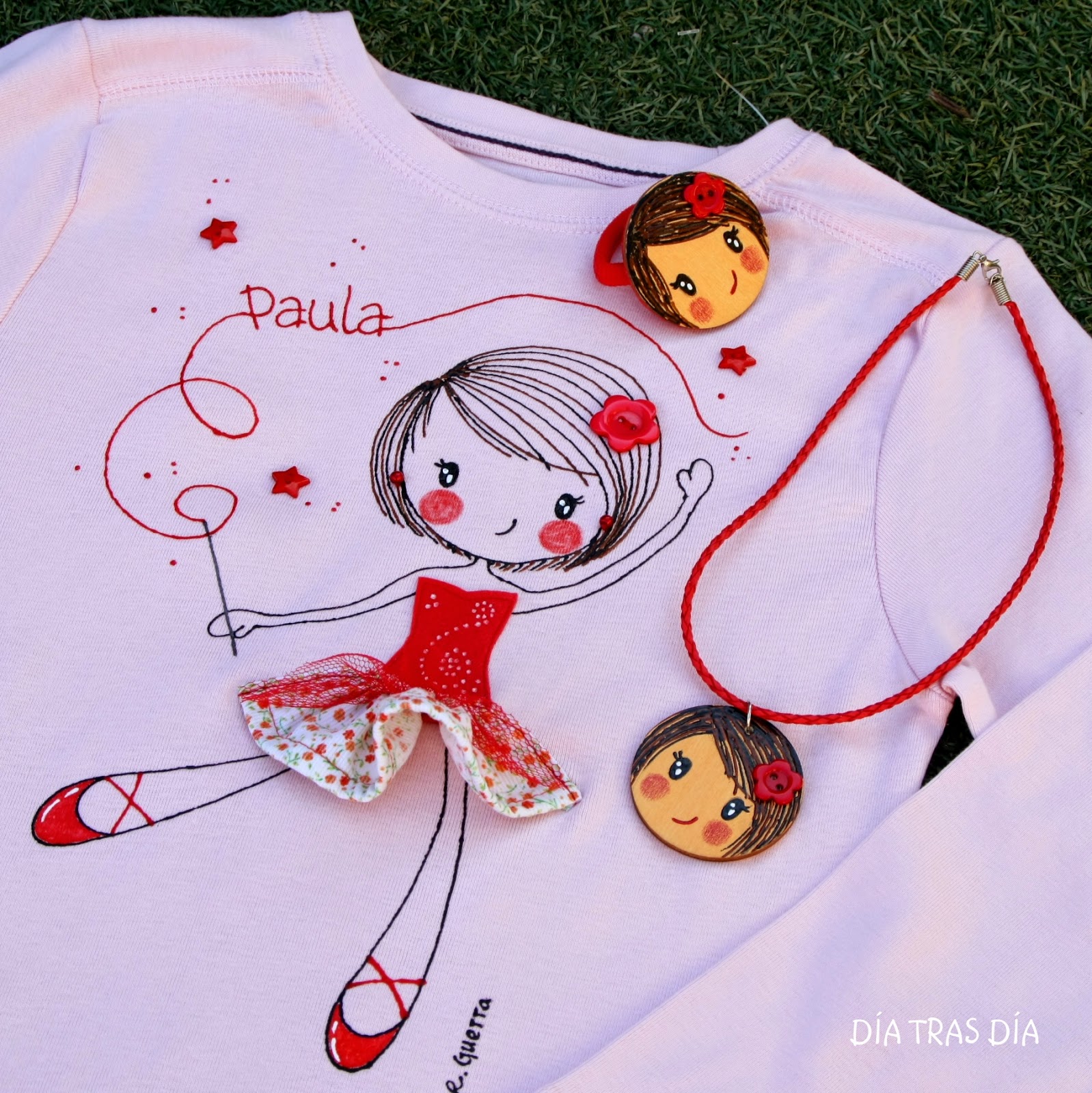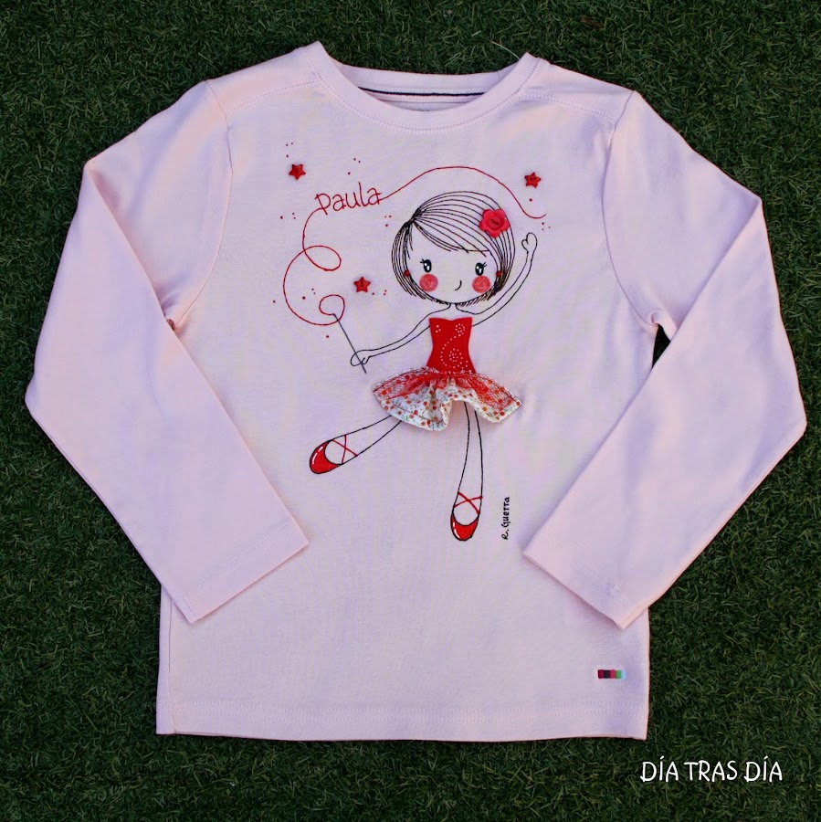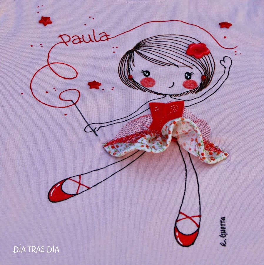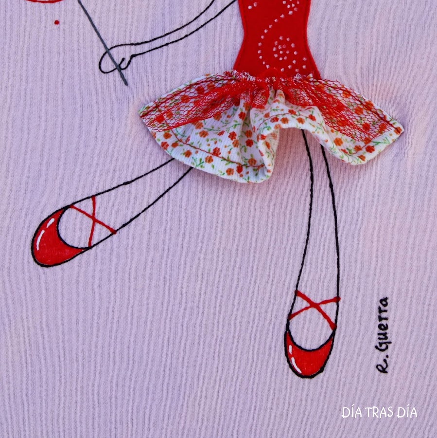 En primer lugar, hice una camisetamodelo Ro-ro bailarina, aunque le hice algún pequeño cambio respecto al modelo habitual, modificando el pelo y los ojos. Y en lugar de usar el color rosa, he tomado el color rojo como protagonista, ya que la camiseta base era de color rosa y no quería que resultase demasiado empalagoso el conjunto.