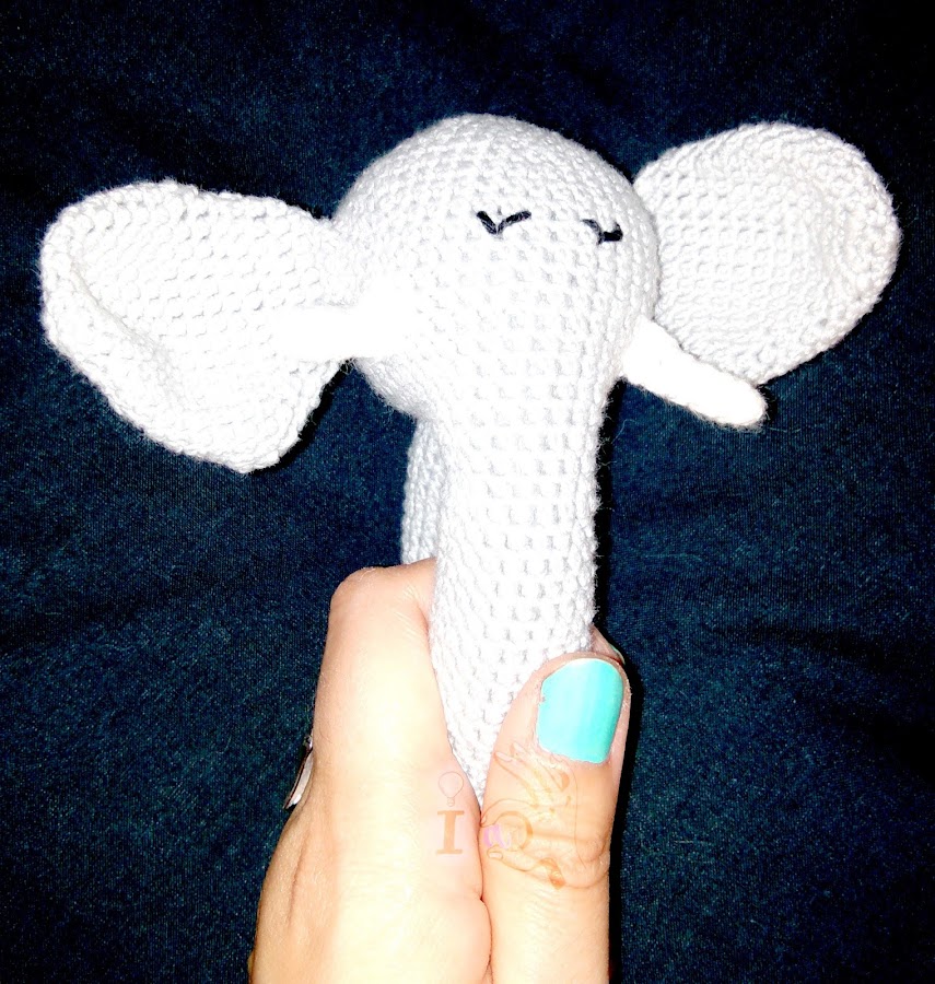 La idea del elefantito la saqué de la página Ayla´s Crafts, y ahí podéis encontrar el patrón que yo apenas modifiqué, sólo que en la trompa no conté las vueltas, hice hasta que consideré que era suficientemente larga. Para que sonara bien le metí dentro de la cabeza la parte de dentro de un huevo Kinder (donde va la sorpresa) con el cascabel dentro, y alrededor el relleno.