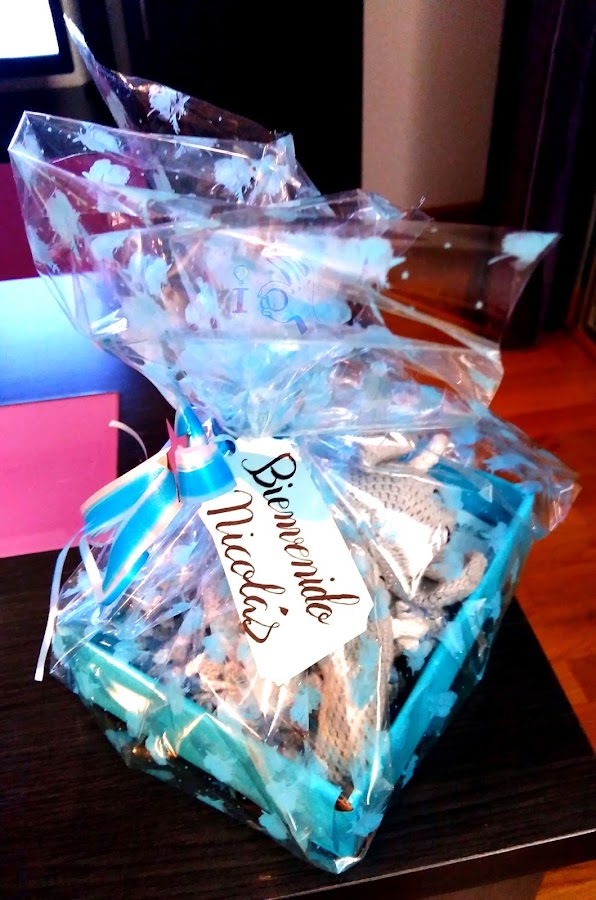 De este modo estaba el conjunto hecho y sólo quedaba empaquetarlo bonito y ponerle una etiqueta para darle la bienvenida a este mundo al pequeño Nicolás.