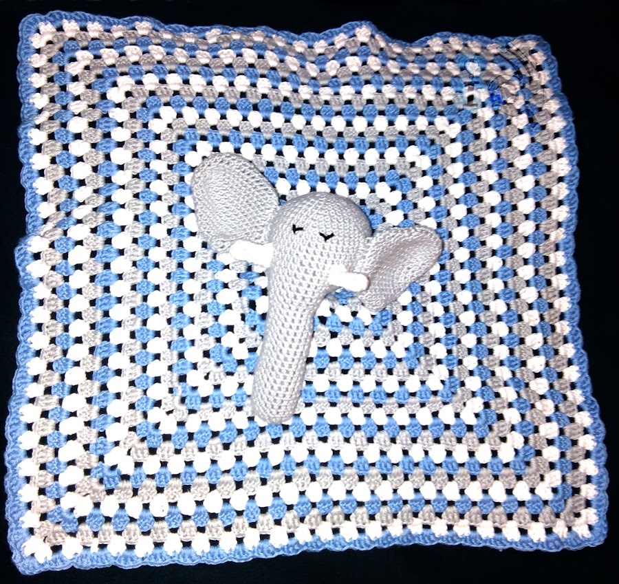 Para la mantita simplemente hice la misma cabeza pero con la trompa más corta, cerrándola en la punta. Y la mantita la hice de granni, basándome en la que enseñan Tejiendo Perú en este vídeo, y luego le cosí la cabeza del elefante en el medio.