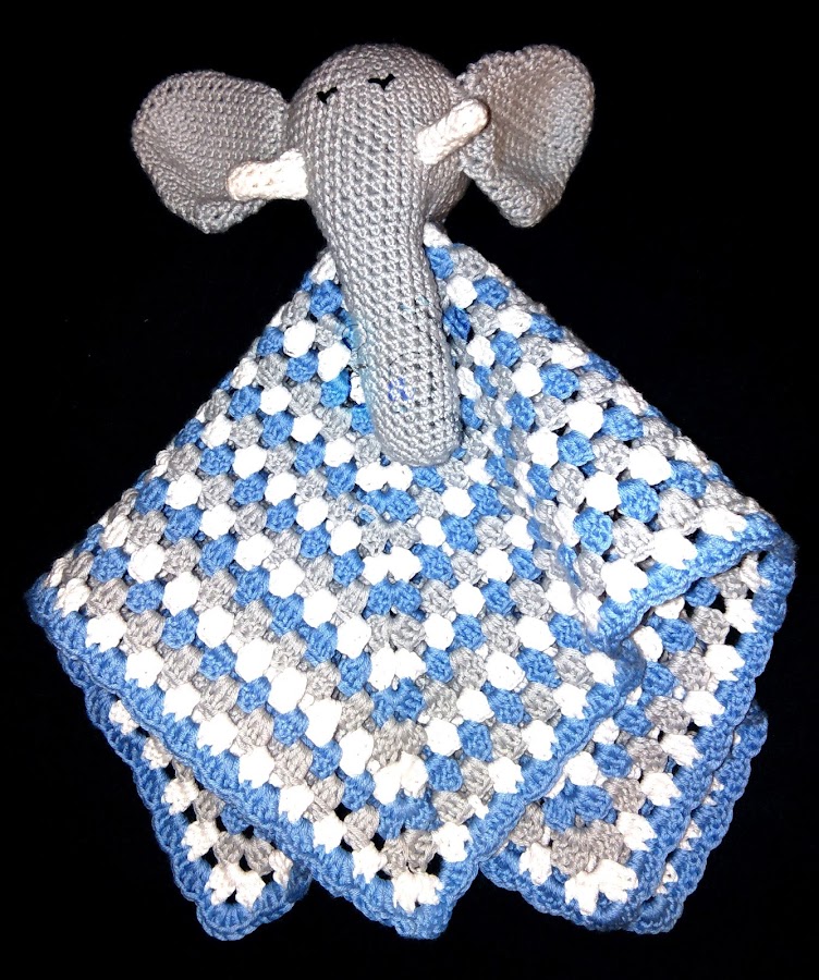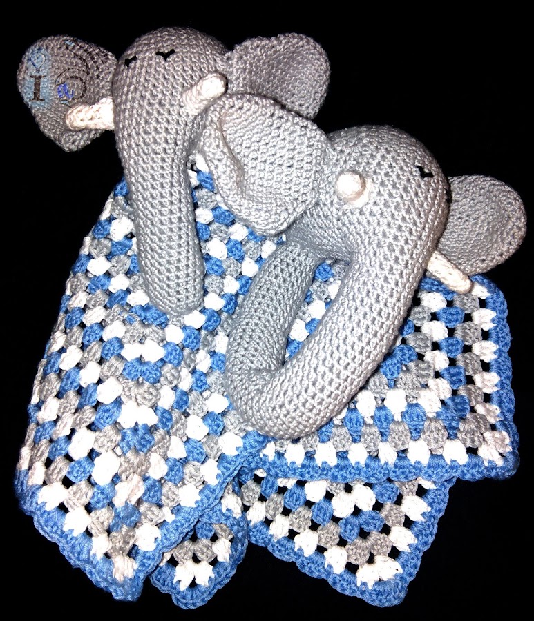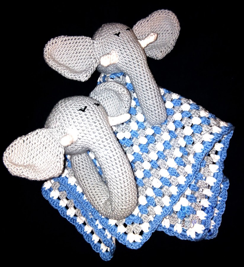 Hoy os voy a enseñar algo que no es nada común en este blog, algo dedicado a los bebés! pero sí, de vez en cuando también hago cositas para ellos, bien porque me las encargan o bien porque mis amigas o familiares tienen descendencia. En este caso fue para un encargo, e hice un conjunto de sonajero y mantita de apego de elefantitos de ganchillo: