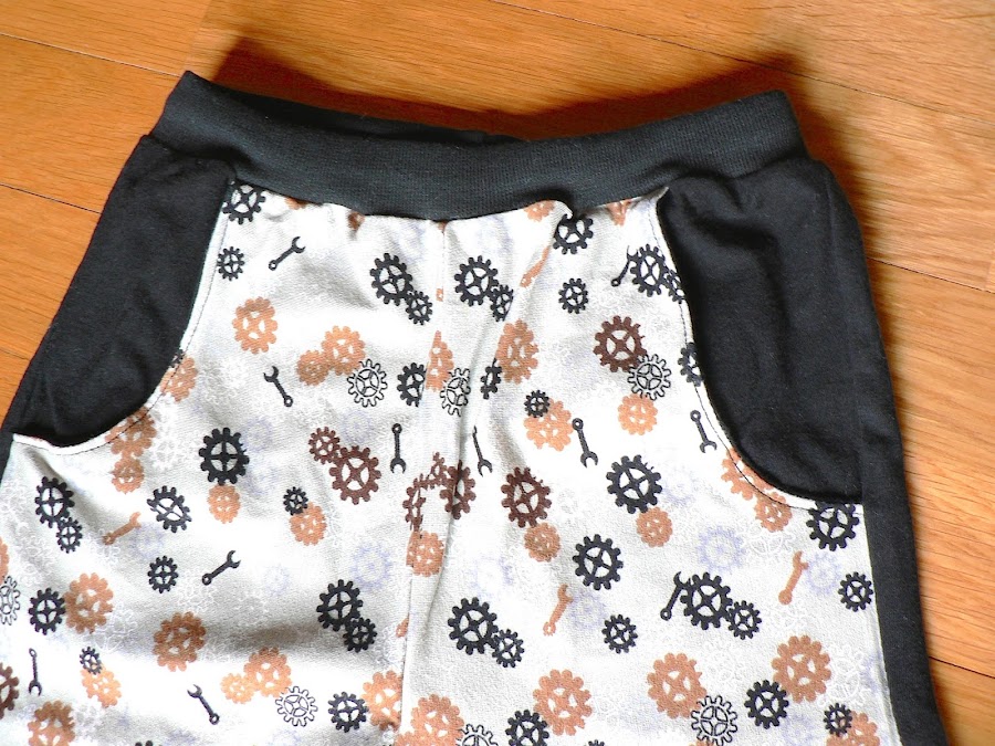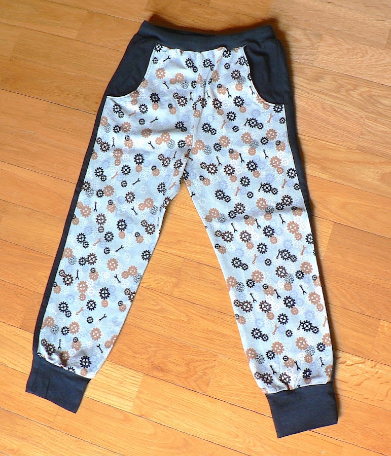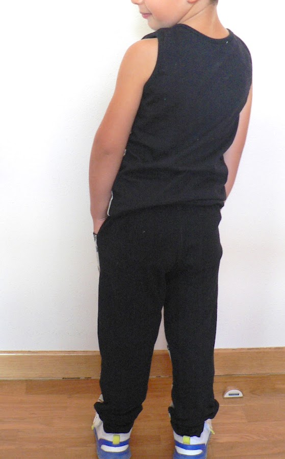 Va todo cosido con la remalladora a excepción de los ribetes de cuello y sisas y los bolsillos por fuera. La cintura la hice con tela de puño acanalado pero le puse goma por dentro. En los bajos del pantalón los puños los hice con tela de camiseta.