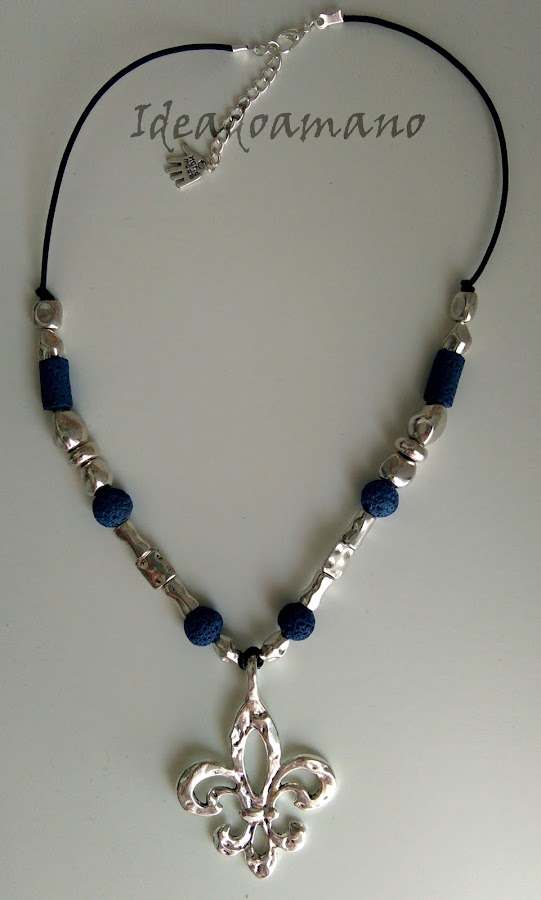 Y como últimamente parece que no me pierdo una pues aquí estoy, pero es que Esther es una gran compañera, y hace cosas tan bonitas que yo no quería faltar a la cita... Y aunque en principio tenía otra cosa en mente, cuando encontré esta flor de Lys en la tienda dónde suelo comprar vi claro que tenía que hacer un collar inspirado en esa tienda que tanto me gusta (y tan cara es) así que empecé a poner piezas metálicas irregulares... y alguna pieza de lava azul.. y así quedó:
