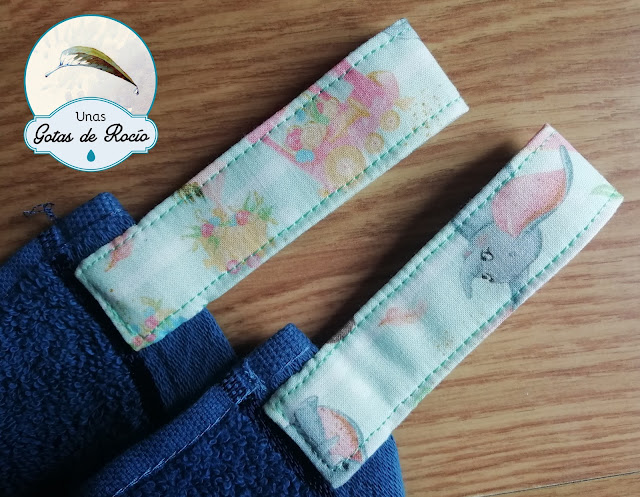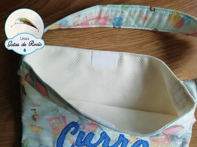 La tela que he usado son escenas de Dumbo en tonos suaves. La taleguita sigue las indicaciones de la guardería: cierre velcro central de 2,5 cm y un asa para colgar.