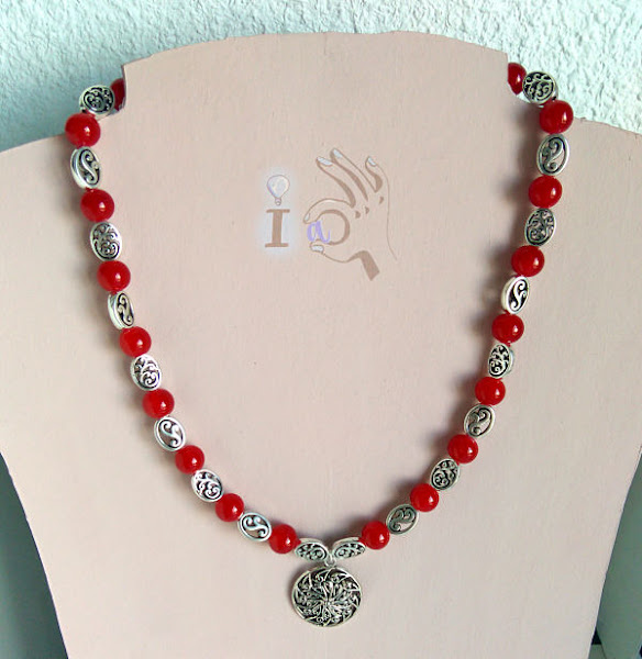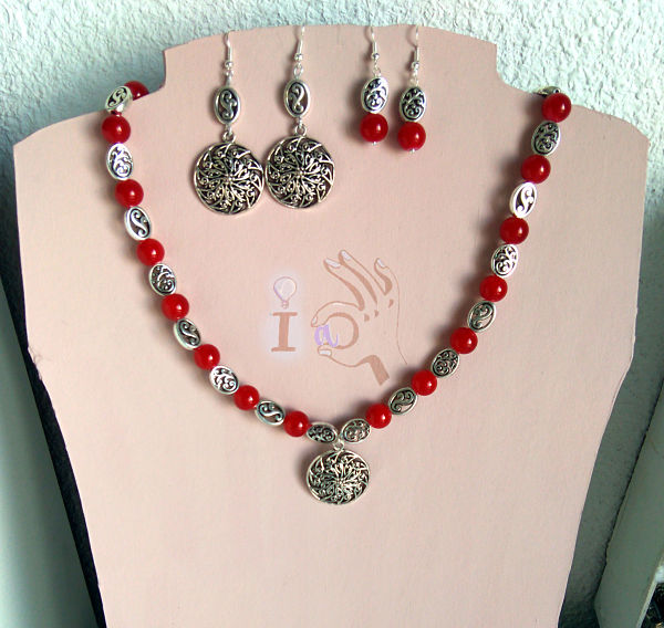 Aquí estoy otra vez para enseñaros bisutería. Hoy os traigo un conjunto de inspiración élfica, por los símbolos de las piezas metálicas que lleva, compuesto de collar y pendientes. Además, para darle un toque de color lleva también piedras en color rojo. Y como no me decidía si hacer pendientes grandes o más pequeños he hecho las dos alternativas.