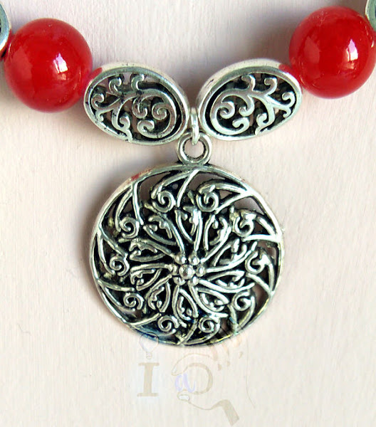 El collar tiene intercaladas las piedras rojas con piezas de dos tipos de adornos: