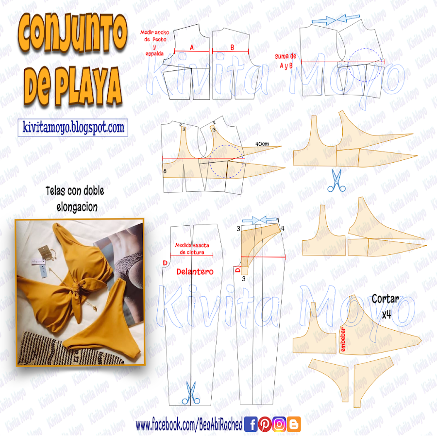 * Ej: si el contorno de busto es de 100cm, cada patrón medirá 25 cm o sea unidos serán la mitad del contorno de busto. Esto quiere decir que medirán 50cm. Si el ancho de la mitad de pecho y espalda miden 20cm cada uno. sumarían entonces 40cm. Por lo tanto se debe encimar desde el lateral los patrones unos 10cm, para que al medir de centro del trasero al centro del delantero mida 40cm. Esto solo se puede hacer si la tela tiene mucha elongación. Por eso recomiendo que sea una con elastanos resitentes, para que no se deforme al estirar.*
