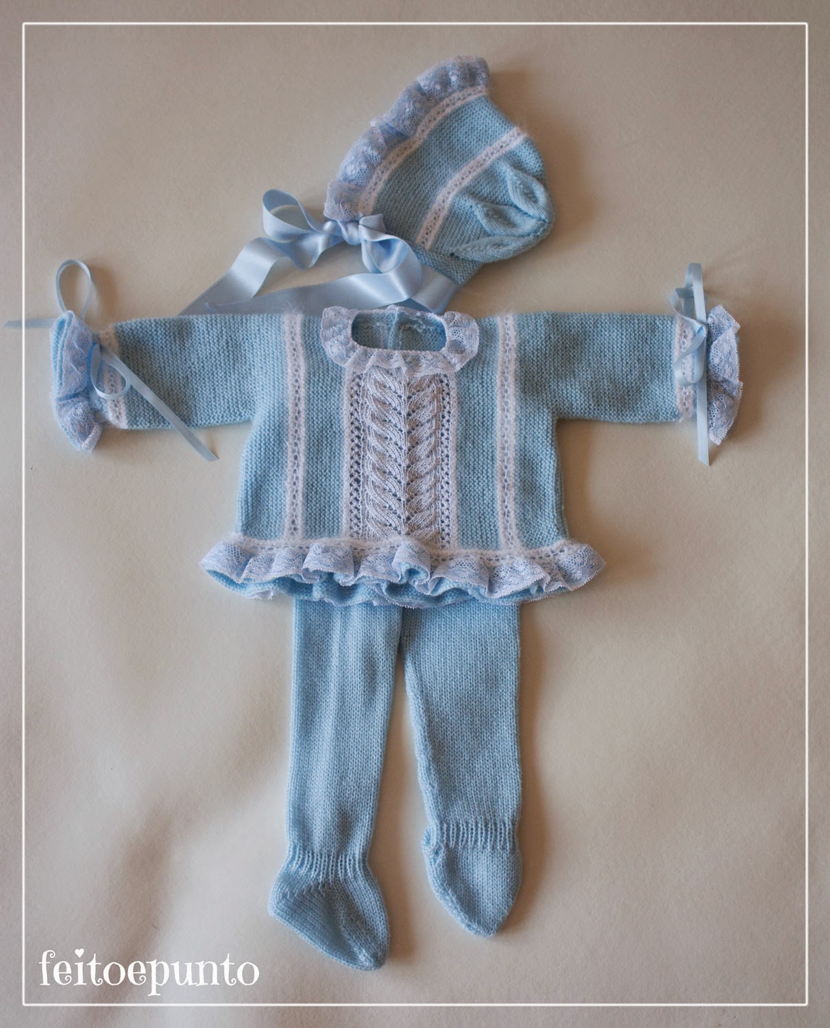 A medida que iba haciendo lo veía muy soso, y muy masculino... no sabía si rematar bajos y puños con puntilla o volantes para darle un toque "mas de niña", y como llegué al final sin decidirme opté por poner las dos cosas: un volante tejido a punto bobo cubierto por puntilla de valencién.