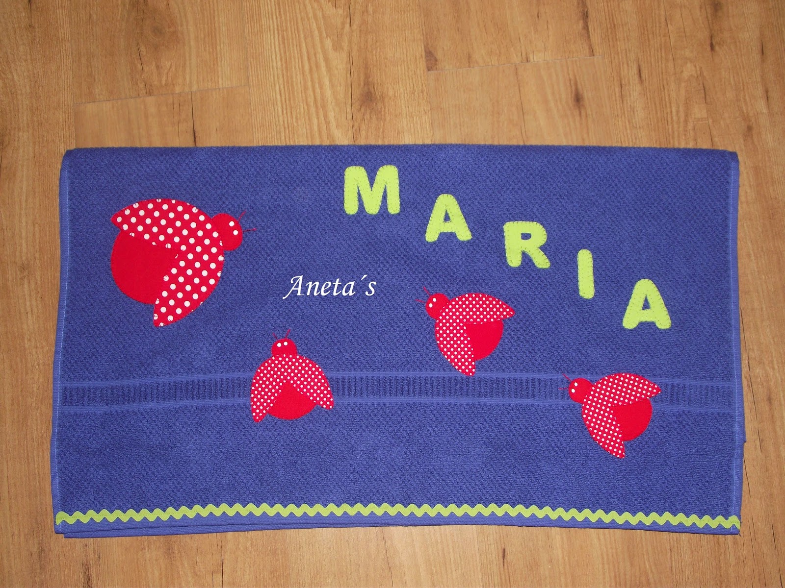 Hoy os dejo una nueva entrada muy veraniega .Esta vez es de una toalla personalizada con unas mariquitas de telas en color rojo a juego con una camiseta. Espero que os guste!!!
