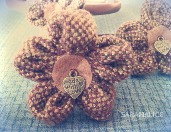 Una flor en tonos marrones y un toque dorado. En el centro de dichas flores un redondel de fieltro marrón, con un charm en forma de corazón que dice hecho con amor (en inglés).