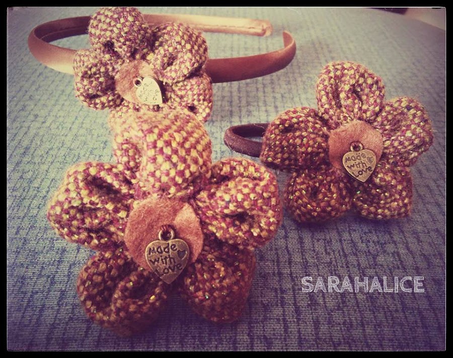 Se trata de un conjunto de dos gomas del pelo y una diadema, con la misma flor todos los elementos.