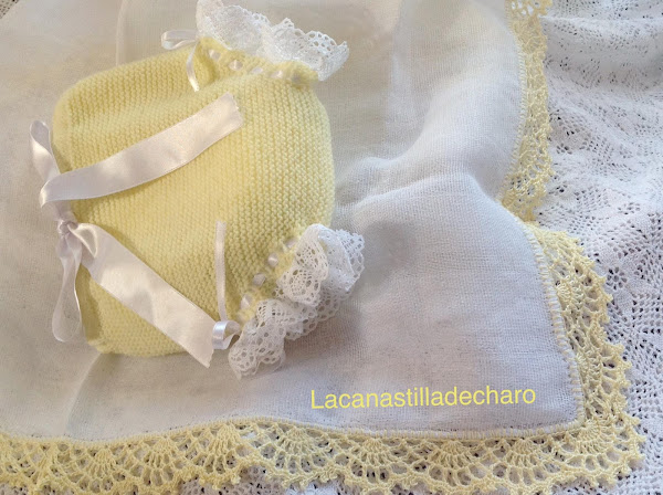 ESTE TRABAJO ESTA REALIZADO CON LANA DE BEBE DE LA MEJOR CALIDAD Y LA PUNTILLA, ES TIRA BORDADA, ADQUIRIDA ESTE VERANO EN UN PUEBLO DE PORTUGAL, DONDE PASE UNOS DÍAS ESPECTACULARES.